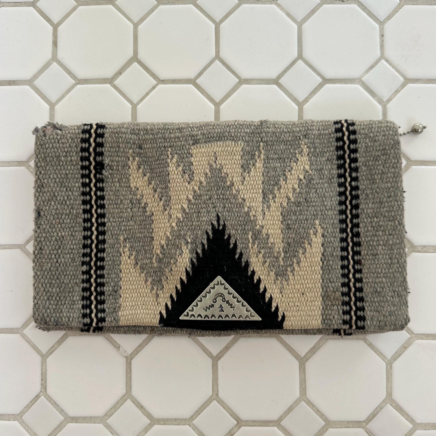 Rare 1940s (maybe 30s) Ganscraft Original Chimayo Clutch / Black Grey and Cream Colorway / Silver Ball Talon Zipper / Silver hammered triangle attached to inner snap closure / Inner coin purse / Back Handle for belt / Original Satin lining in as-is condition as pictured