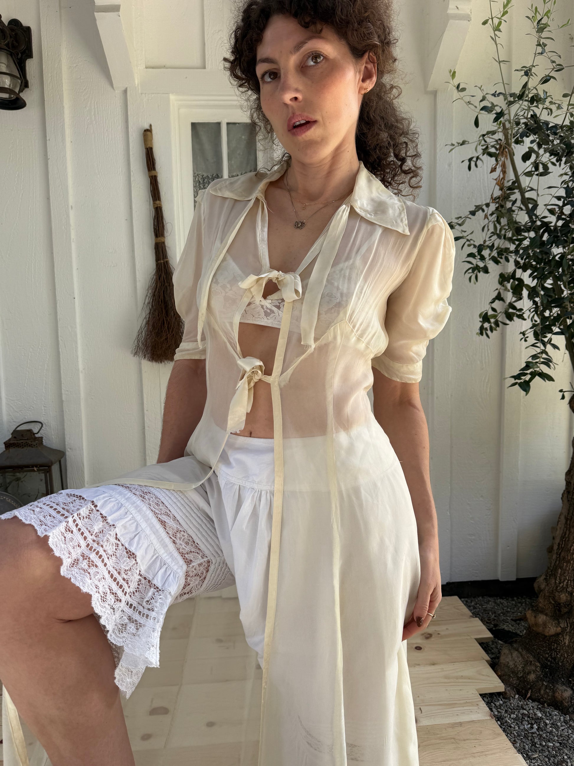 1940s Sheer White Nylon Collared Robe with Bows *as-is
