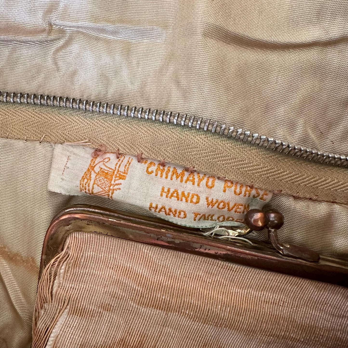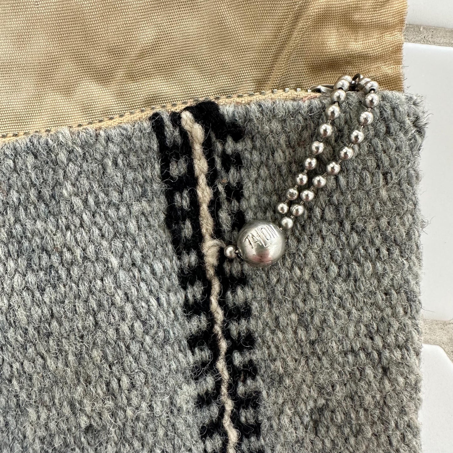 Rare 1940s (maybe 30s) Ganscraft Original Chimayo Clutch / Black Grey and Cream Colorway / Silver Ball Talon Zipper / Silver hammered triangle attached to inner snap closure / Inner coin purse / Back Handle for belt / Original Satin lining in as-is condition as pictured