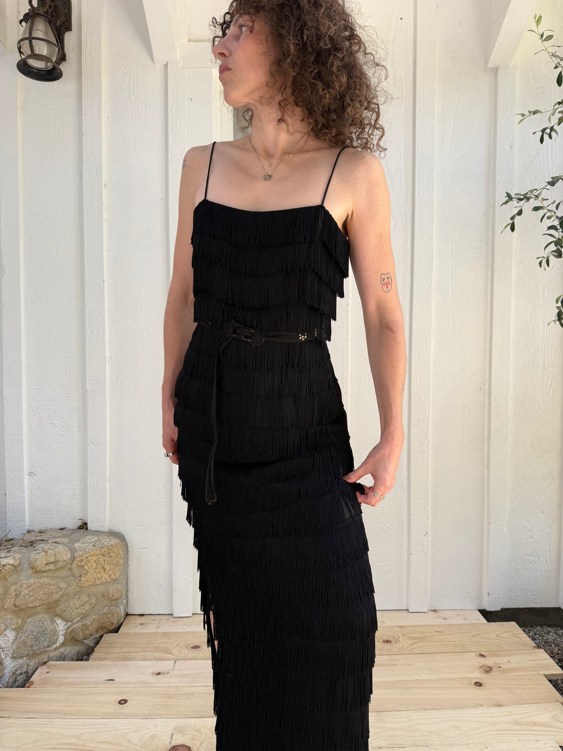1970s Lilli Diamond California Tiered Black Fringe Evening Dress / Center back zipper/ spaghetti straps/ fully lined/ waist seam / Leg Slit