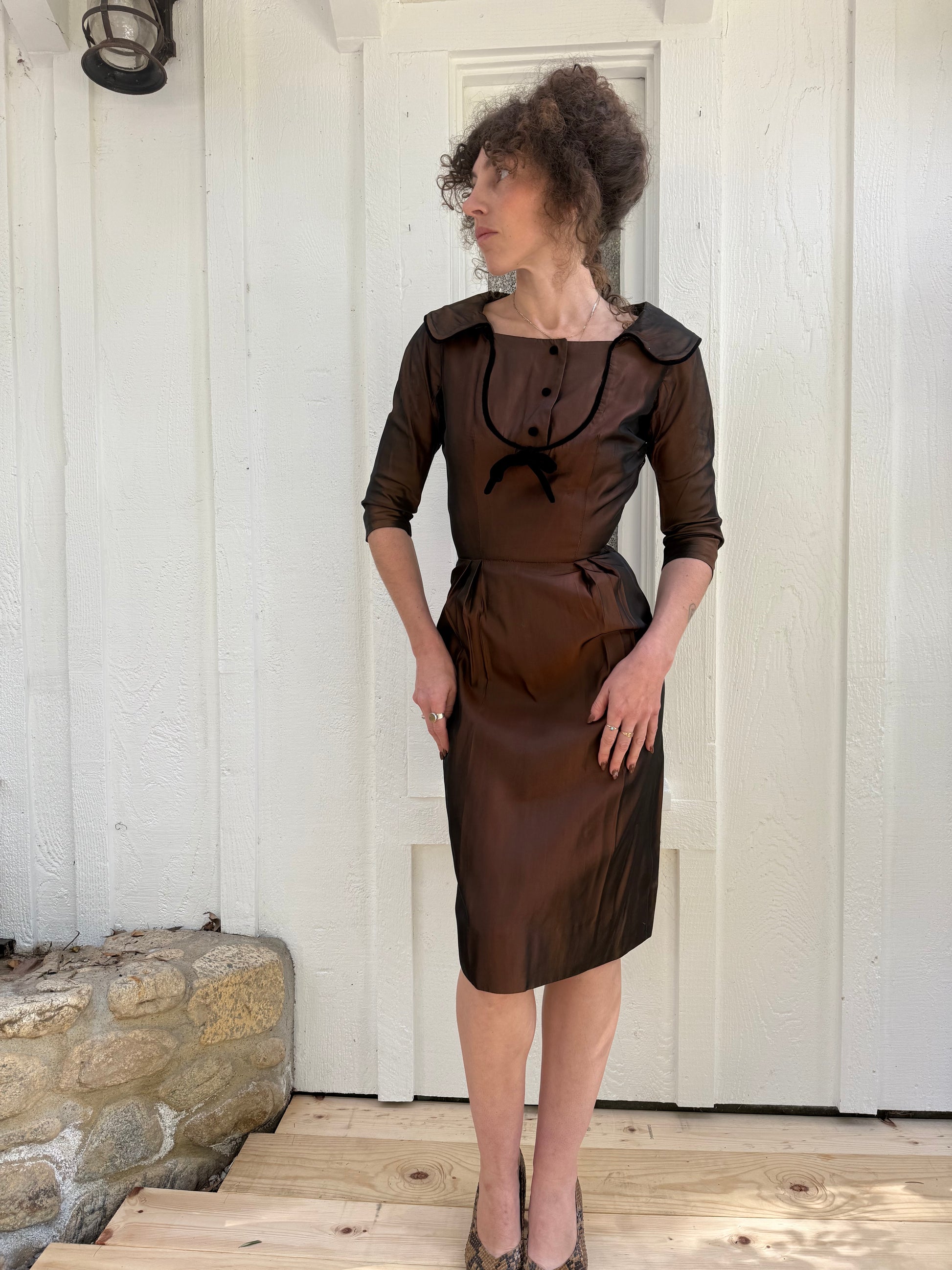 1950s "Vogue Special Design" Brown Taffeta Cocktail Dress with Velvet Bow / metal talon side zip, 3/4” Sleeves, Velvet Trimmed Wide Collar, Velvet center front buttons and bow, Very 1950s Barbie