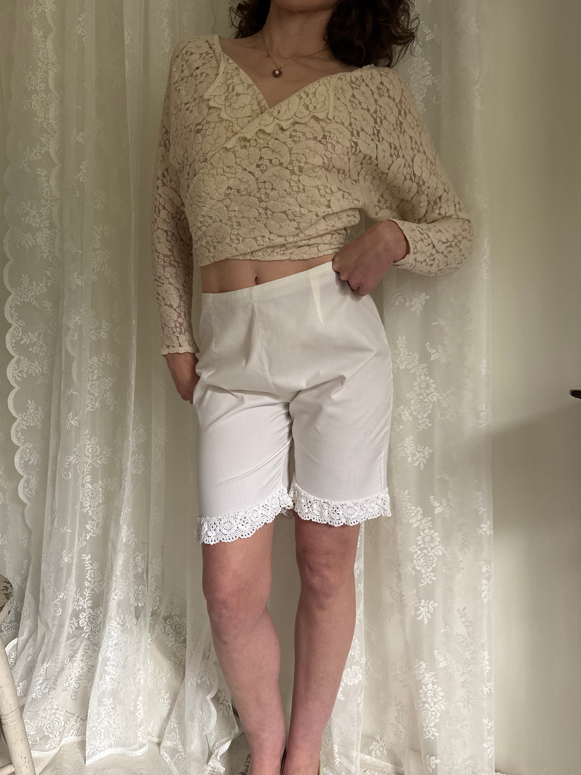 1960s White Lace Trimmed Cotton Shorts / Crochet Lace Trim/ Center Back Metal Zipper with Button closure / Mid Rise - super cute