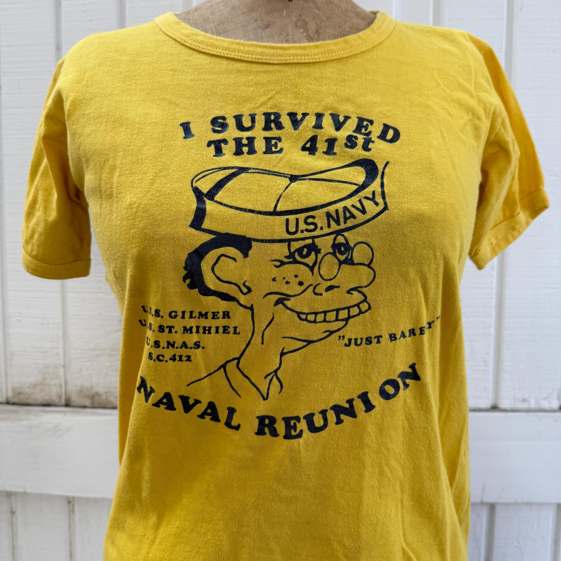 1960s Naval Reunion US NAVY 41st Character Tshirt S / Label Removed / "I Survived The 41st Just Barely" "Naval Reunion" "U.S.S. Gilmer, U.S.S St. Mithiel, U.S.N.A.S, S.C.412" / No Side Seam