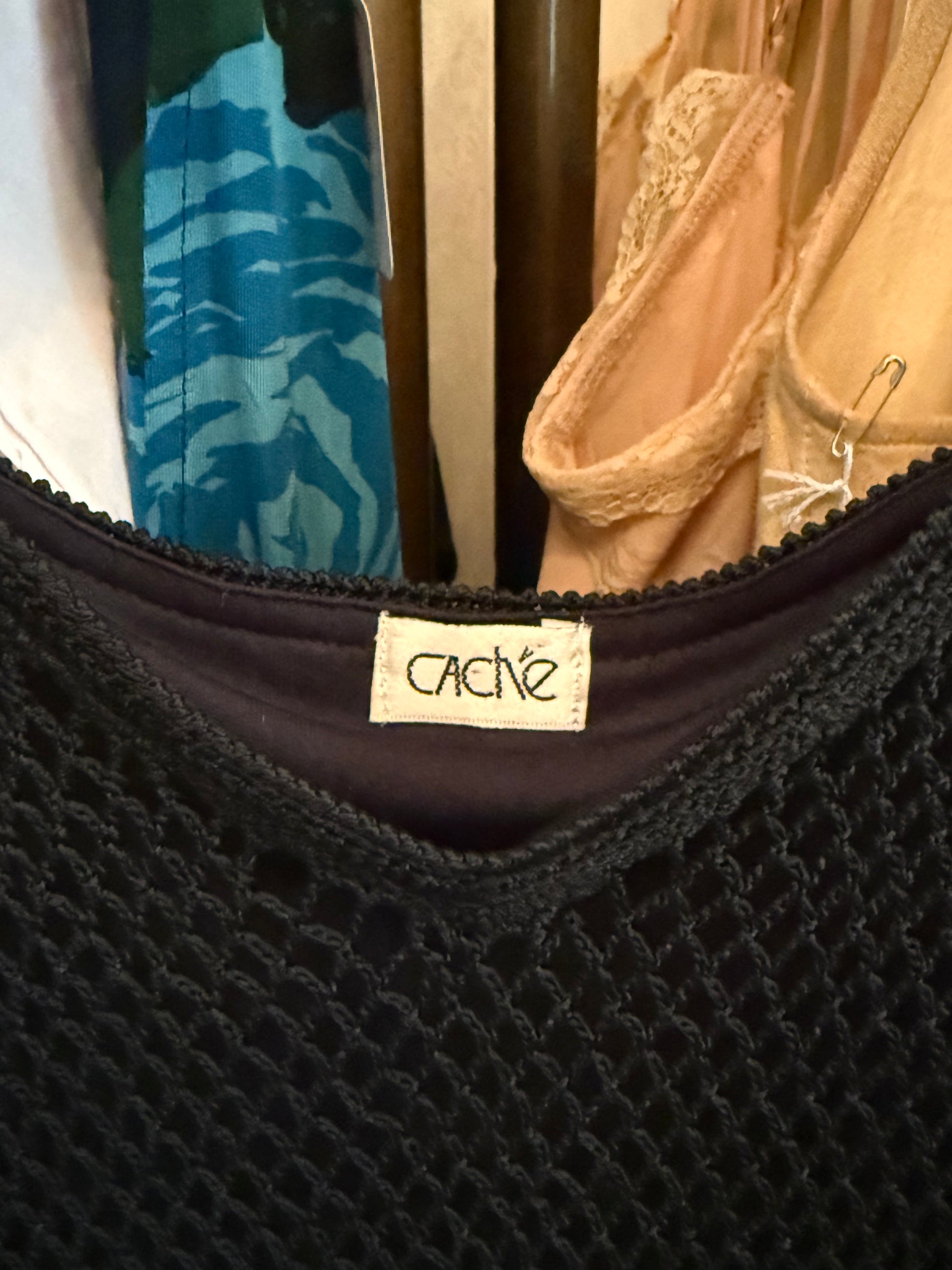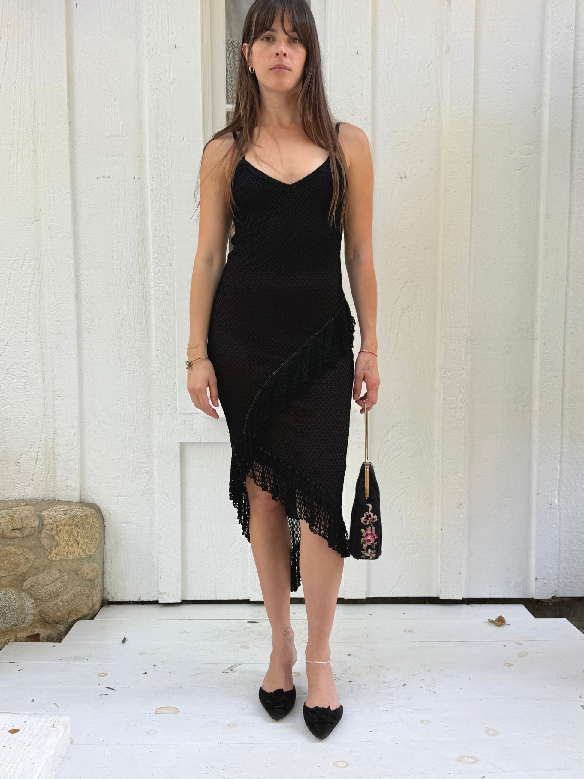 1990s Cache Black Beaded Crochet Asymmetrical Midi Dress