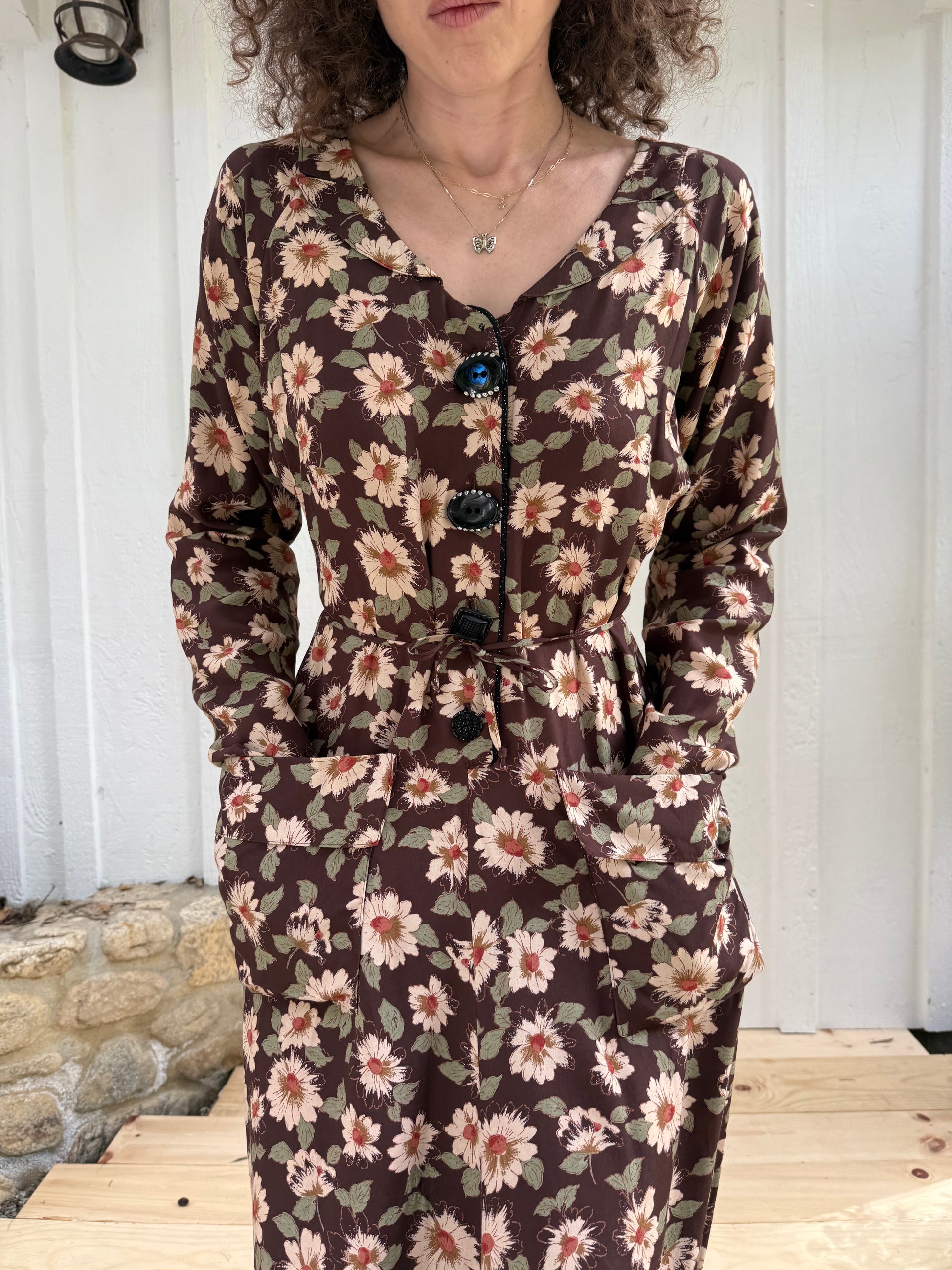 90s Lolita West by Fox Trot Brown Floral Rayon Dress/ 100% Rayon Made in USA Label size S can fit M, wide open neck, curved collar, center front mismatched black buttons some art deco and snaps, two front pockets, Brown Floral, long sleeve, waist tie at back